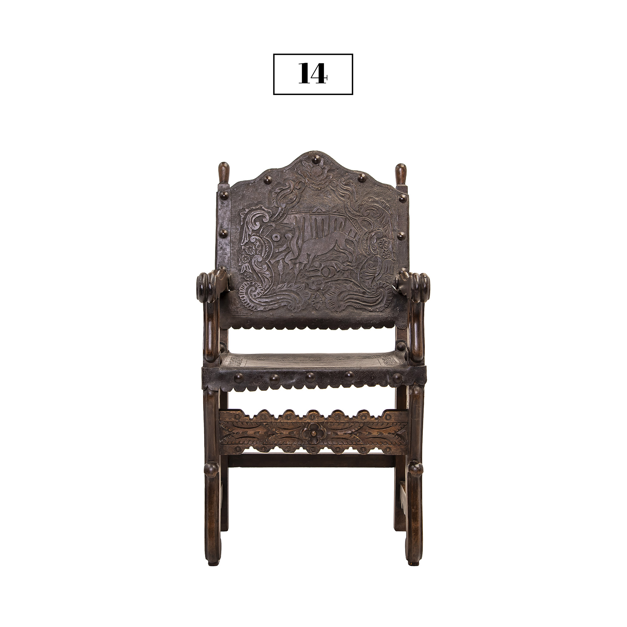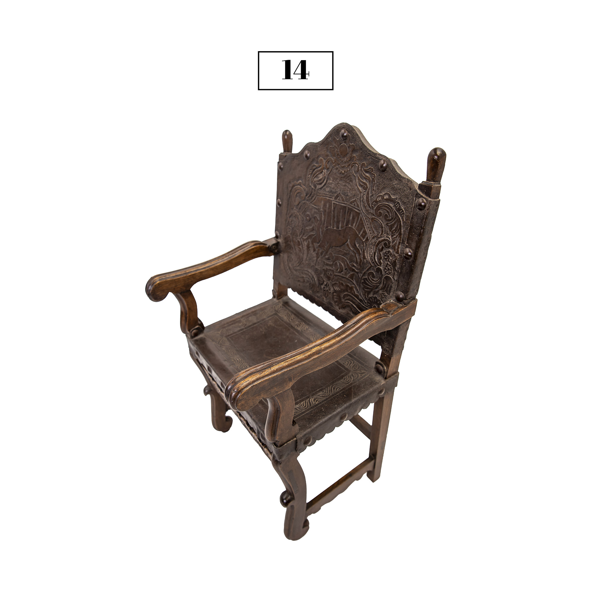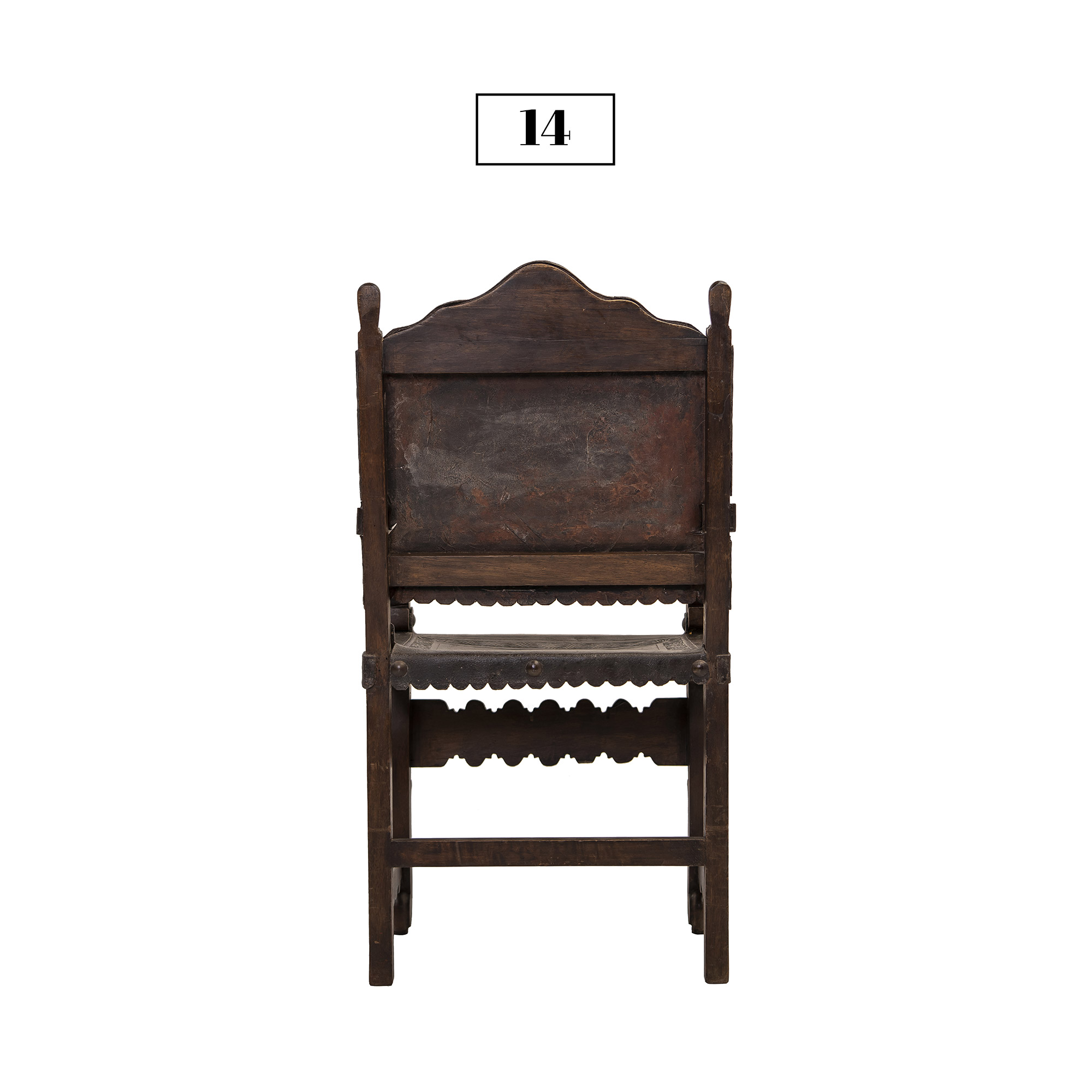 This friar’s chair (or frailero, in Spanish) is made of alder wood. The seat and back are made of embossed leather and the remnants of the chair’s original paint have been conserved. It was rescued from a Colonial house in Cusco city that was under repair. This piece dates back to approximately the 18th Century.