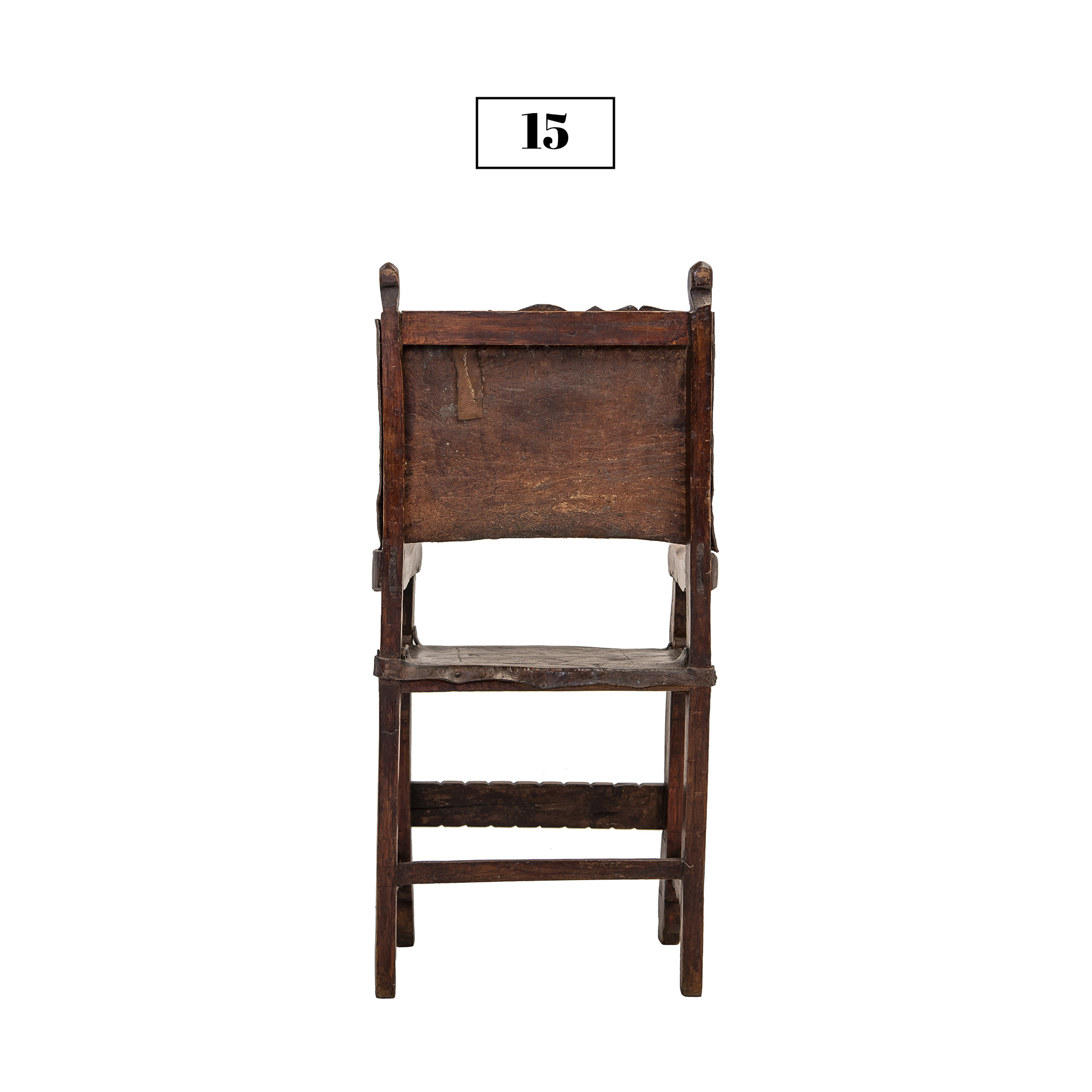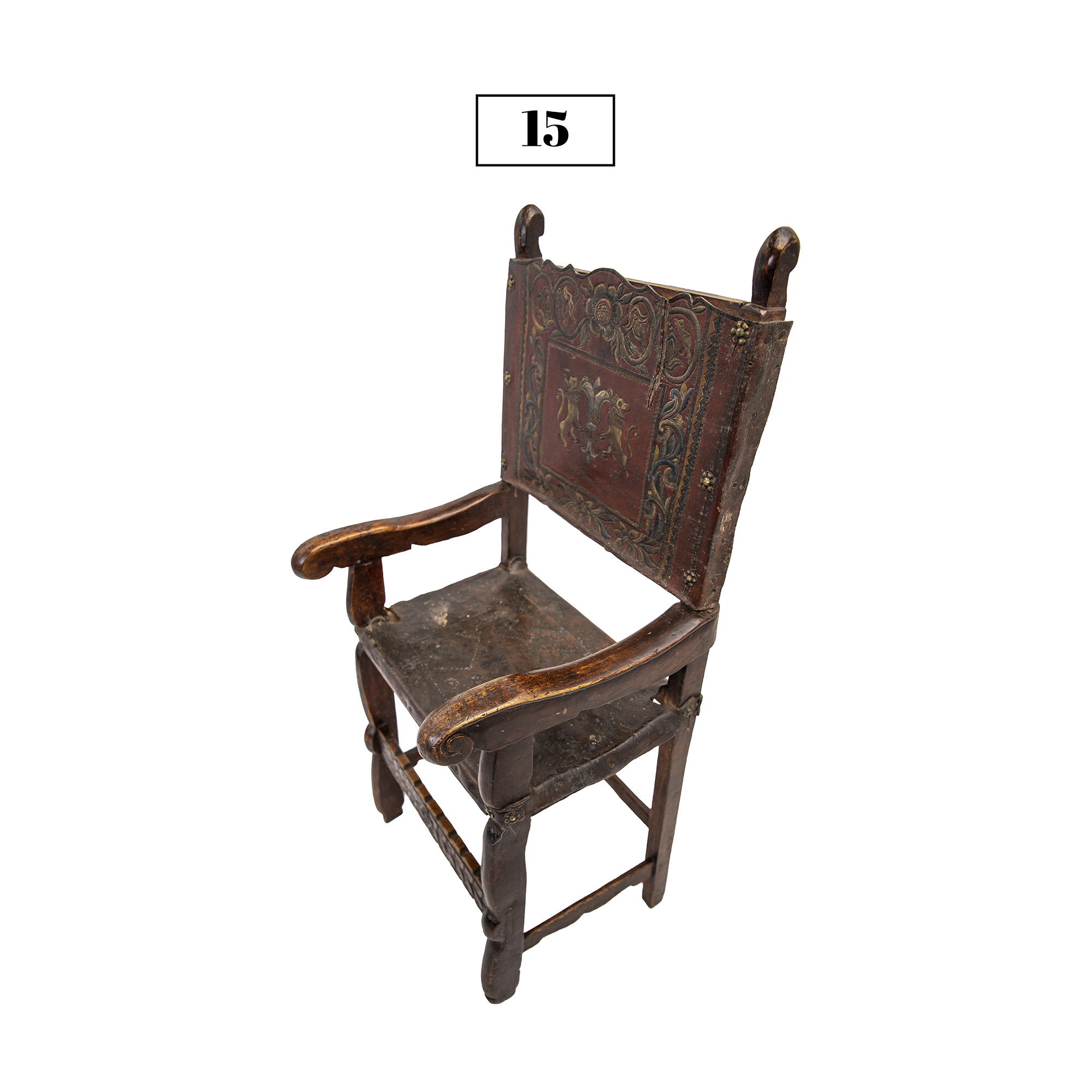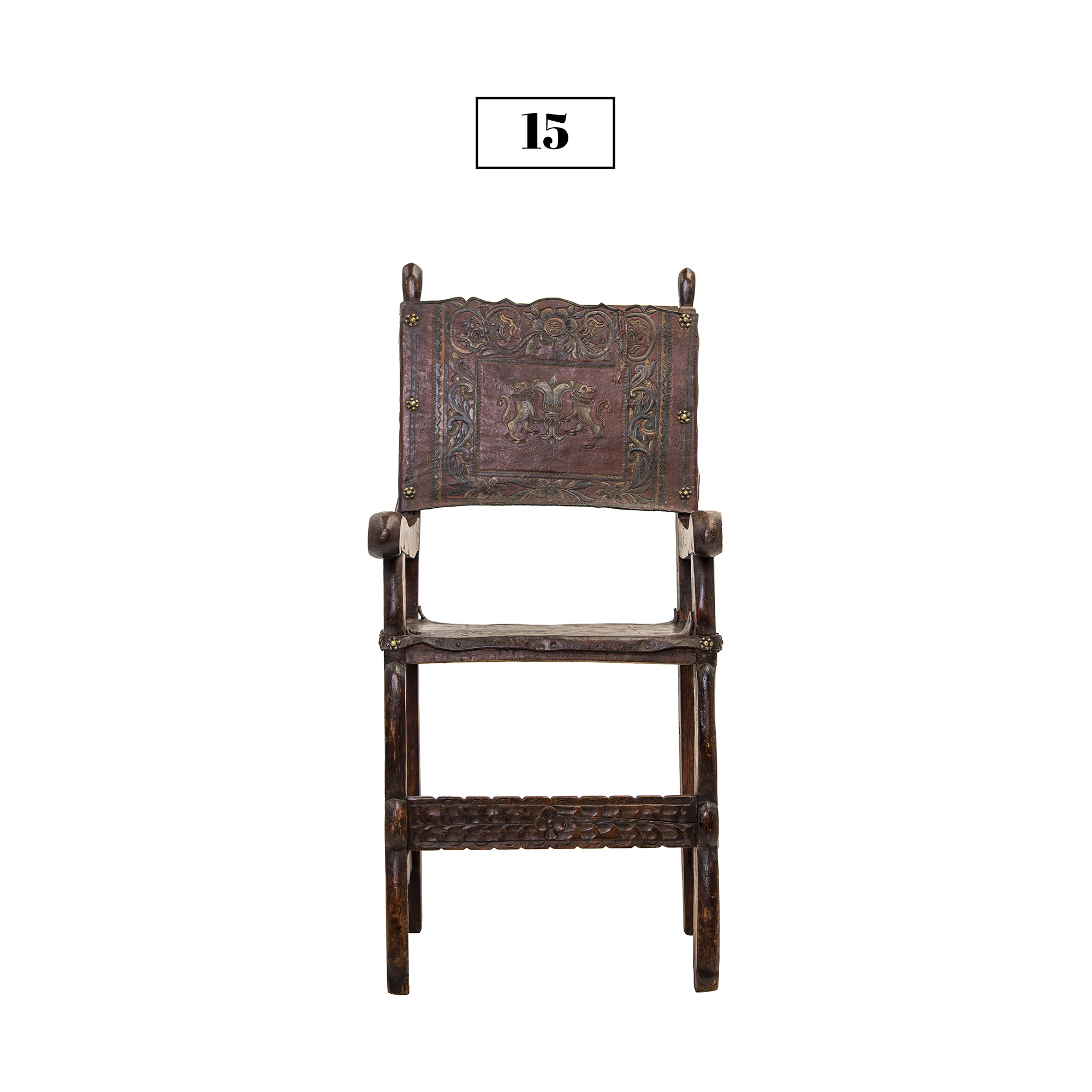 This friar’s chair (or frailero, in Spanish) is made of alder wood that displays carvings and varied colors. It has bronze pins and the original embossed leather. It was rescued from a Colonial house in Cusco city that was under repair. This piece dates back to approximately the 18th Century.